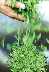 后来,乾隆皇帝回到宫中。太后见他好几天未曾来请安,问他到哪里去了。乾隆皇帝怕挨骂,连连说龙井风景如何如何美,龙井茶叶又是如何如何好,想到口袋里还有那日摘的茶叶,赶快掏出来。那茶叶已被体温烘干了,如同炒过的差不多,扁扁的,一叶宽一叶尖,就像大清朝的旗帜和长枪。他回想起狮子峰下令人赞赏不已的潺潺泉流,低头看着掌心的茶叶沉吟了好一会儿,称其名曰“旗枪”,并传圣旨到杭州府,规定以后每年清明前采下的龙井茶都要进贡朝廷。